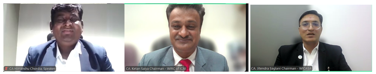 Left to Right: CA. Himanshu Chordia, Speaker, CA. Ketan Saiya, Chairman, WIRC, CA. Jitendra Saglani, Chairman, WICASA.