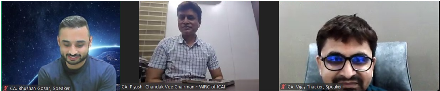 Left to Right: CA. Bhushan Gosar, Speaker, CA. Piyush Chandak, Vice Chairman, WIRC, CA. Vijay Thcker, Speaker.